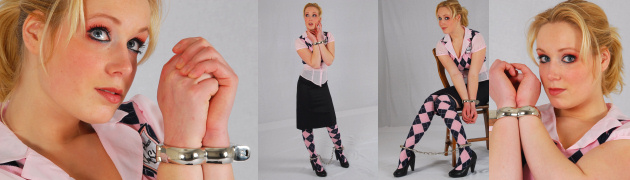 Sanne’s wrists only just fit into the Irish 8 restraints! It’s very hard to move with your wrist so tightly cuffed, so tight that she can’t even move her elbows apart. Sanne looks great in her pink schoolgirl uniform, black heels and darby style leg irons! She has never been cuffed in these old style cuffs before, so she doesn’t know how the keys work. Will she get out or just frustrated? Watch and see!
