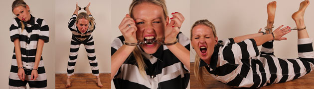 We caught ourselves a real nice prison girl! It’s the tall and very agressive Scandivian sports girl Ingrid B! She is an olympic athlete, yes it’s true… but we can not mention her real name or she will kill us. It doesn’t matter, it is still lots of fun to hogcuff her, and leave the keys next to her, she will have to struggle to get to the keys and then find the keyholes, but she is probably too angry to do that ;-)