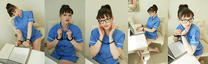 It’s an office day for nurse Lizzie Bayliss. She doesn’t need to treat any patients today, it’s just computer work and lots of papers to be filled in. We figured she wouldn’t mind to be cuffed then, as she will just be sitting down in the office all day. But maybe Lizzie had a different opinion about that…
