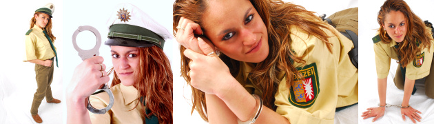 German police woman Naomi is glad to demonstrate her handcuffing skills… on herself. Naomi is a dreamer, focussing completely on posing for our camera, but she forgot where she put her key. Those are her real handcuffs, so Naomi is in big trouble… since we’re not going to help!