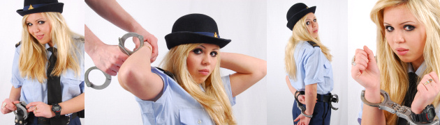 Meanwhile in the Netherlands… Blonde police girl Farah is told to kneel down and put her hands behind her head. She is cuffed behind her back, wrists crossed. You can see this in detail in the image set. Later on, in the video clip, she is handcuffed in front and very frustrated since the keyholes are (surprise) on the wrong side, her hat is annoying her, and her big watch isn’t helping either…