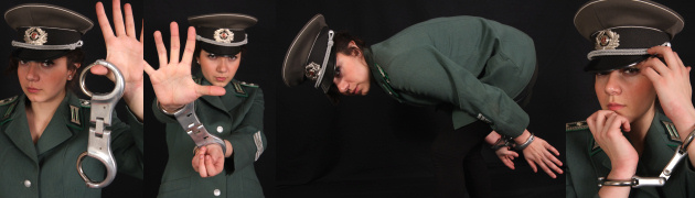 Cute DDR girl Anahí orders you to stop and watch her handcuff trick. She handcuffs herself behind her back and tries to get out again. She even brings the cuffs to the front, something that is considered impossible by a lot of members. Anahí looks hot in her uniform and leather skirt! The big VOPO handcuffs are now her favorite handcuffs, because they are comfortable and rounded. Maybe we should let her wear them for a day?
