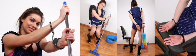 Our new maid is doing a great job cleaning the office in handcuffs. Irene is a lovely girl, working hard and she is not even complaining about the cuffs. So we cuff her hands behind her back to see if she still works as hard. Irene does not seem to mind. Until she runs out of water, at which point we thought it would be a good idea to ballgag her and make her drool into the bucket to refill it…