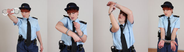 Rookie police officer Anna will show us how handcuffs work. Good, because we don’t know anything about that ;-) As expected, Anna does very well at first, academy training showing through. But then she makes the inevitable mistake, and she gets mad at us for not helping her out! What? You wanted to show us how it’s done, now do it!!