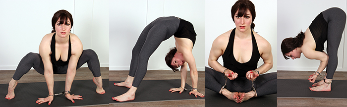 Abi is a contortionist and circus performer! But can she still perform with her hands cuffed? She is first cuffed in front, but she still manages to pull off some impressive poses. So I had to cuff her wrists to her ankles to see if that would limit her a bit more. What a girl! Abi is amazing!
