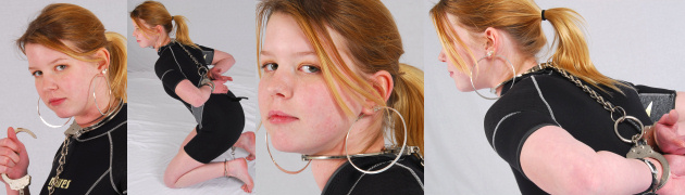 Our lovely model Kylie is wearing a tight fitting scuba suit. She is a very shy and soft spoken girl, but we decide we will not go easy on her today. We add a pair of leg irons and a neck cuff, then we lock Kylie’s wrists behind her back, attached to the neck cuff. This is a very hard position, as her arms get more and more tired, she is choking herself to the point of ragged breathing. But Kylie is a real fighter, she does not give up, even though escaping is nearly impossible! The struggle video is unbelievable!