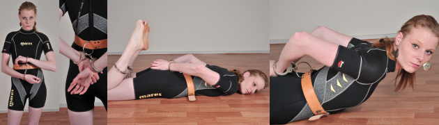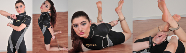 Diver girl Melissa is practising her self cuffing skills. She does not have much cuffing experience, so it will be fun to watch if she gets stuck (or rather: when she gets stuck). Melissa looks hot in her scuba suit and gear! Will she be able to impress us, or will she be writhing and struggling around on the floor in a mess of cuffs?
