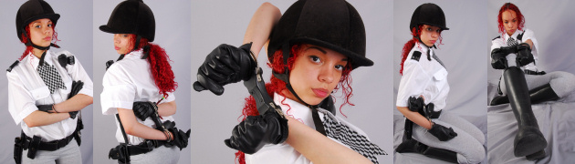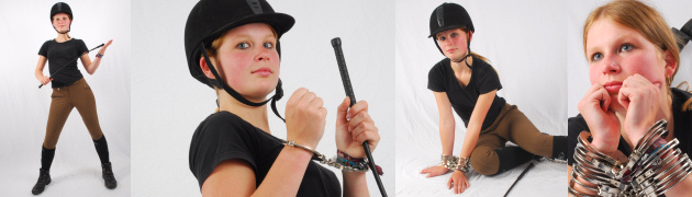 Equestrian girl Adora is more than a little annoyed!! We have cuffed her and attached her cuffs to a leather prison belt. She thought we would only handcuff her today, and she secretly planned to ride her horse in cuffs (she can do that). But attaching her cuffs to the belt changed everything. She can’t get ONTO her horse now! We didn’t think about that. Sorry Adora!