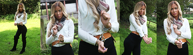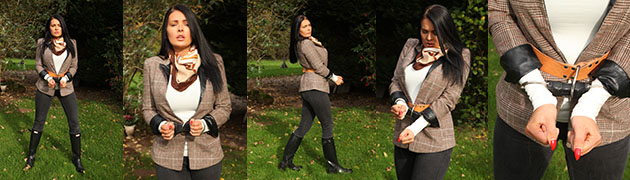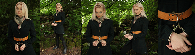 Zabrina Black wanted to go horse riding in the forest, but we cuffed her in a leather prison belt with handcuffs attached in front. She is not happy obviously! She tries to wriggle out of the belt and cuffs, but they are just too tight. All she can do is pace up and down the path in her riding boots until someone decides to release her. But there is not much chance that will happen, as Zabrina looks stunning in riding gear and restraints! Who would want to let her out?
