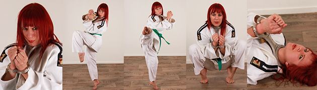 Super flexible Little Lanta went to her martial arts class to train and demonstrate her awesome skills. She is so flexible, she can do ultra high kicks, handstands, splits, she’s a real ninja! But things didn’t really go as planned when I showed up with my handcuffs and leg irons. Lanta ended up in a hogcuff position, and not even a tiny ninja can get out of that!