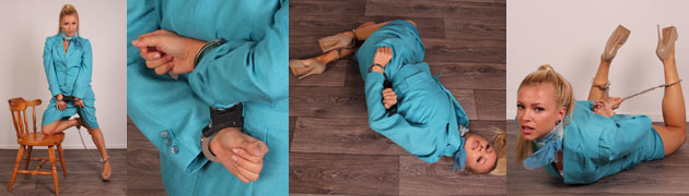 We like this hogcuff variation! The one where the cuffs are attached to a leather prisoner belt. This pulls the ankles back a lot more, and the hands are stuck to the small of the back! Okay, it is a little more extreme, but to make up for that, we have locked Brittany in some pink restraints! That should cheer her up! We just drop a key on the floor and watch her struggle to free herself from this extreme hogcuff!