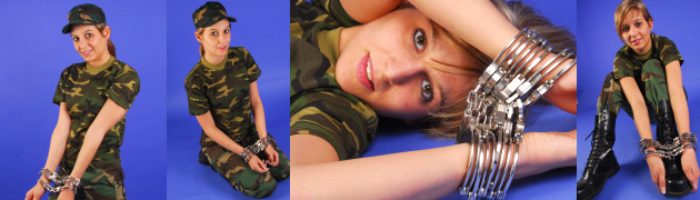 Lovely prisoner Marieke is in full chains: handcuffed tightly in front to her waist belt, connector chain down to her ankle cuffs, no room for movement at all. Still, Marieke is very curious about her restraints. She examines every detail, just to see if there is a hidden way out of this. She rattles and pulls, but it is hopeless. Marieke will have to go to sleep, chained up like this.